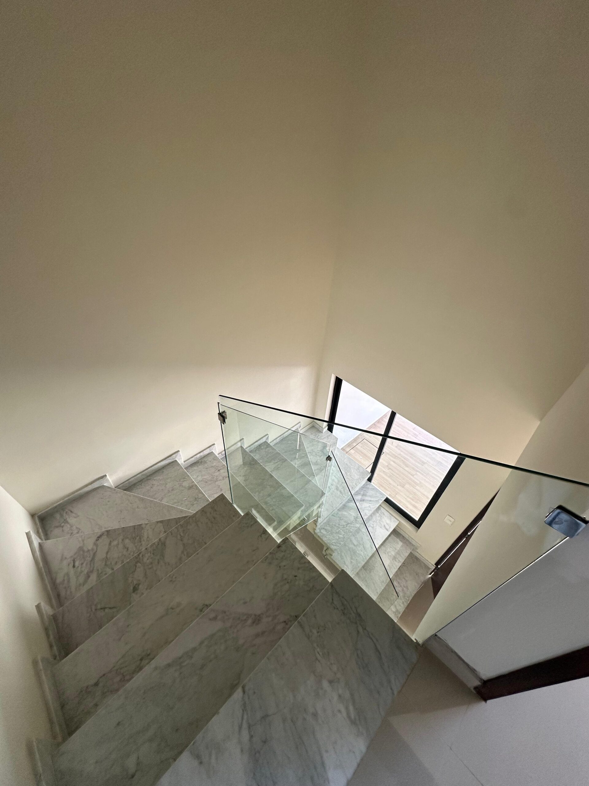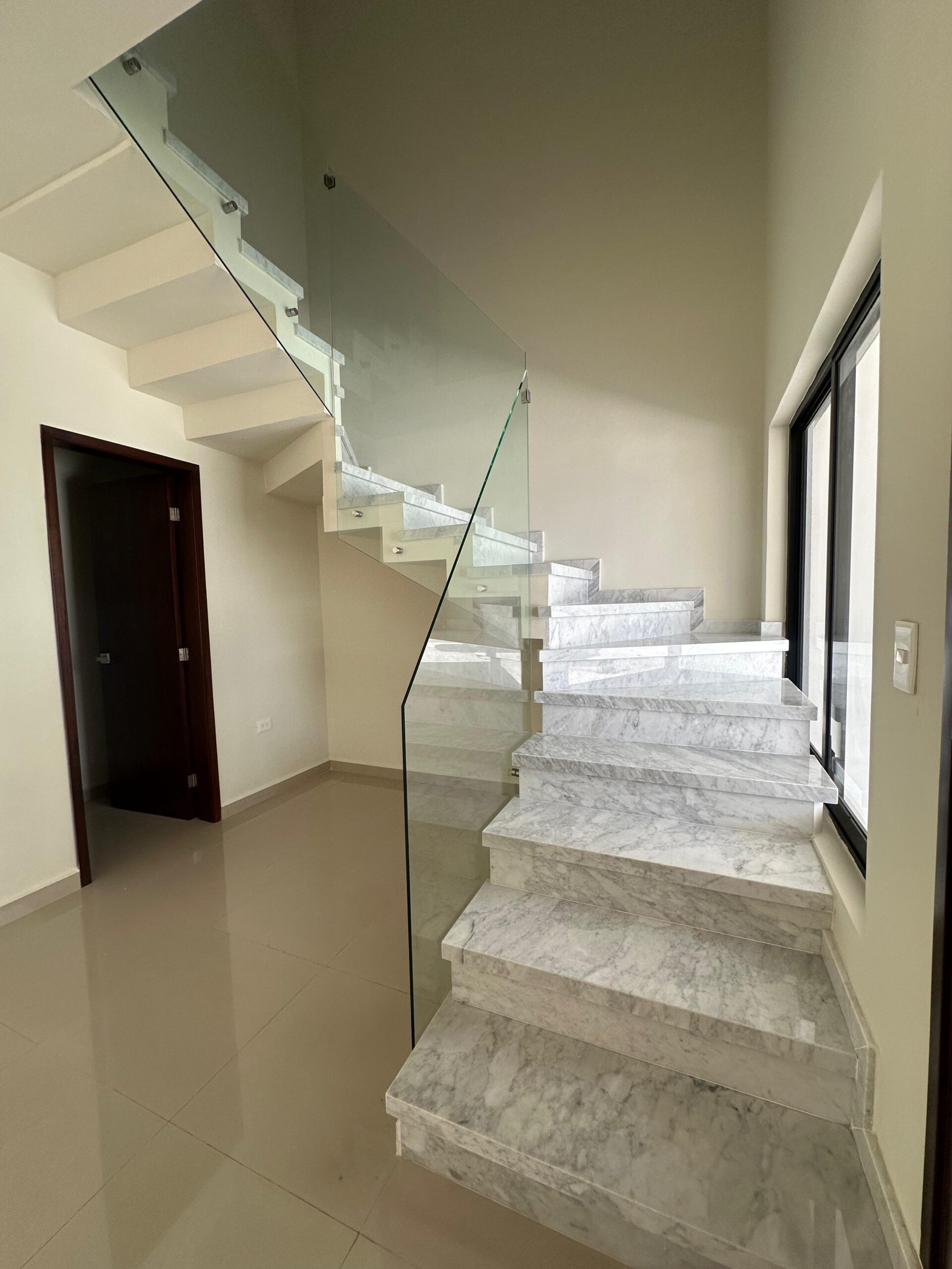 ✅ Escalera de mármol con pasamanos de acero inoxidable, un toque de lujo y elegancia.